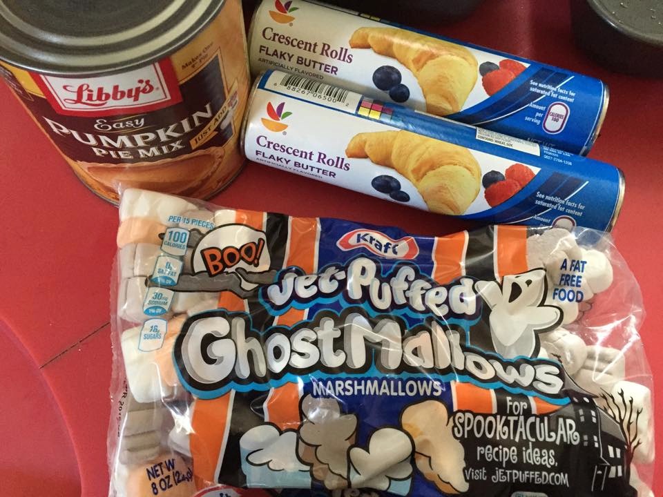 If you have an old, rickety house like me with old appliances, you might not be willing to go all out on baking from scratch, so I went the easy route with the three-ingredient recipe that Buzzfeed had to offer. I wasn’t sure if my experiment was going to turn out great, so I got the generic crescent roll brand from Stop & Shop (they all taste the same, anyway… unless you have a thing for only buying brand-name items). I also spent quite some time looking for giant marshmallows and couldn’t find any of them, even in the candy aisle and baking aisle, so I decided to go for these cute Halloween-themed marshmallows! Make sure you buy the pumpkin pie mix because there are TONS of pure pumpkin pulp cans in the grocery stores and not many pumpkin pie mixes on the shelves!