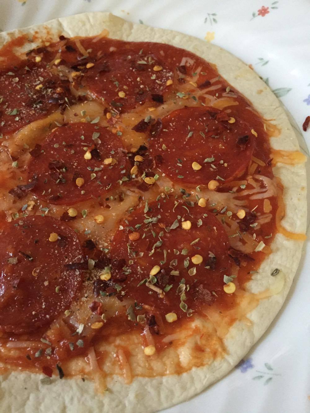 This was my traditional tortizza with pepperoni and cheese - Pop them into the oven on a baking sheet, pizza tray, or just on aluminum foil itself for about 5 minutes or until you’re satisfied with your “crust” crispiness.