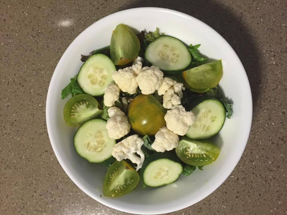 When we got back to our apartment with my < $20 purchase (yes, all this in the photo was less than $20!!), I was famished and ready to eat, and since I had bought two bags of mixed greens, you can say I was in the mood for some salad! I dug up the cauliflower and cucumbers in my fridge and got to work.