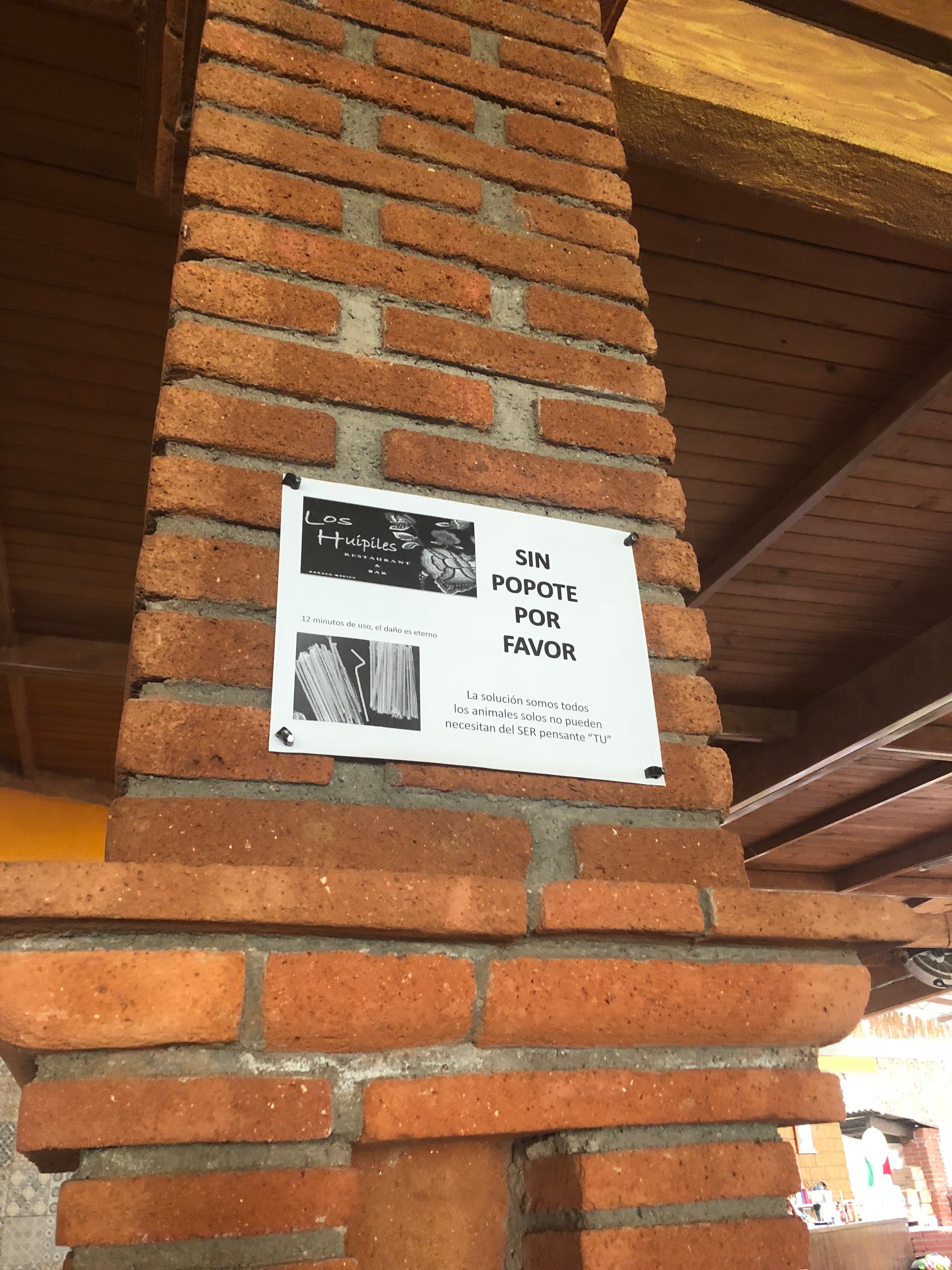 In the restaurants and stores of Oaxaca City, anuncios could be seen everywhere instructing customers to do one thing: ditch the plastic. At a restaurant, the sign said in big letters sin popotes, or “without straws” in efforts to inform the public that they proudly do not provide straws in their drinks in efforts to combat plastic pollution. At the Tree of Tule, the ticket counter signs say di no a las bolsas de plástico which translates to “say no to plastic bags”. At a local pharmacy, a similar sign was on the table counter that told customers that they did not supply plastic bags.
