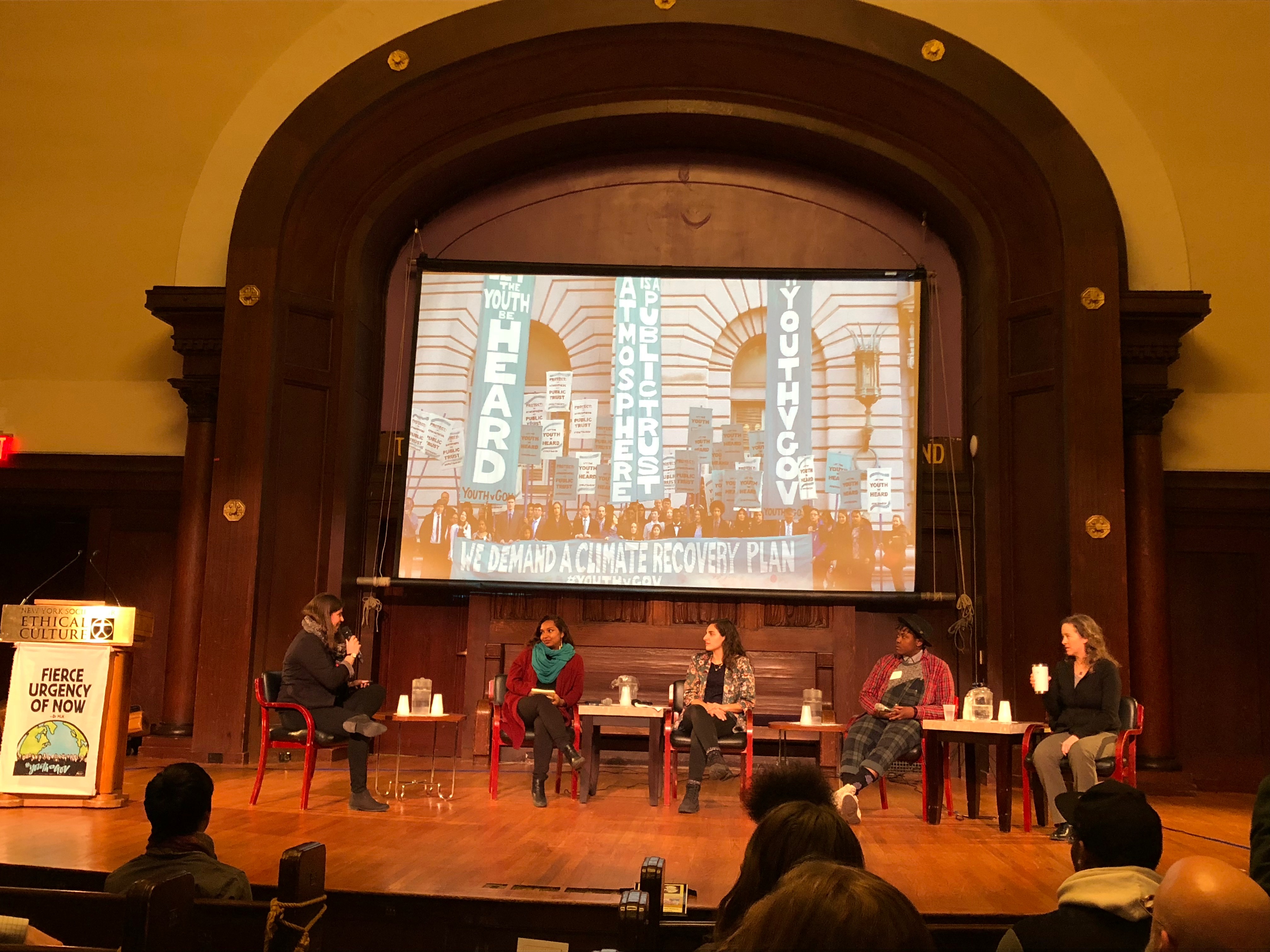 Moved and energized by their statements, the event transitioned into the panel featuring Thanu Yakupitiyage (US Communications Manager of 350.org), Sara Blazevic (Co-founder and Managing Director of Sunrise Movement), Vic Barrett (one of the plaintiffs in Juliana v. United States), and Julia Olson (Founder of Our Children’s Trust and lawyer representing the plaintiffs in the case). So much great conversation took place during this panel and I’ve synthesized their thoughts and recommendations.