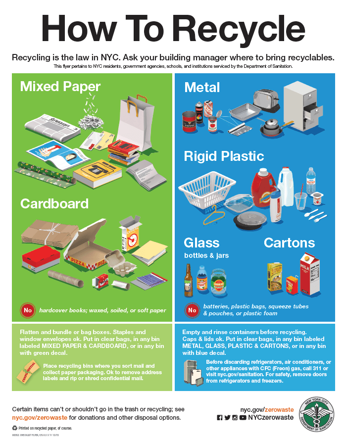 In a nutshell, NYC’s recycling messages will say that the DSNY accepts rigid plastics and not to worry too much about what each number means. These numbers were created by the plastics industry to indicate what kind of plastic the item is made of. If you are curious, most recycling programs will accept #1 (PET or PETE) and #2 (HDPE) plastics, but always check with your city’s program to be sure!