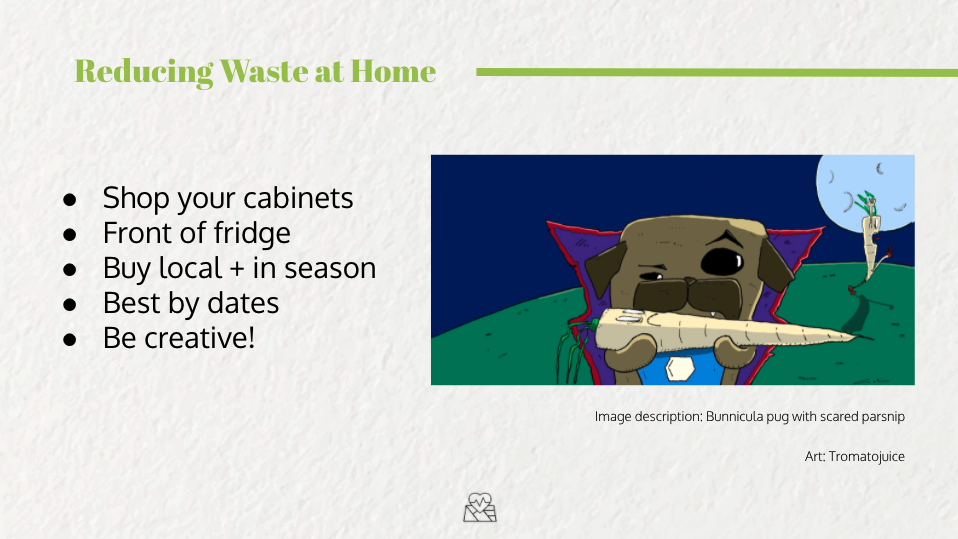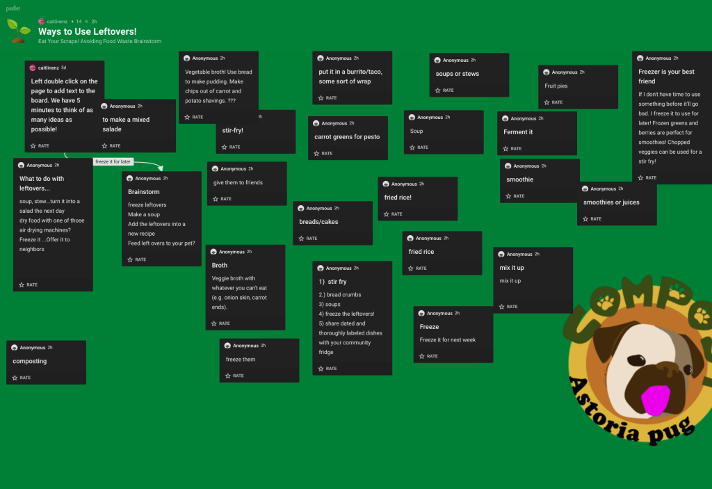 For this How to Prevent Food Waste at Home workshop, I invited two NYC locals, food waste prevention extraordinaire Cait Enz of Hops and Brains, and our city’s favorite four-legged passionate grassroots composting pug Astoria Pug (represented by Lou Reyes) to the conversation. These two individuals presented a wealth of information about how they prevent food waste in their households, and I was also equally as impressed and inspired by our engaged participants who shared the many ways they divert food waste in their kitchens, too!